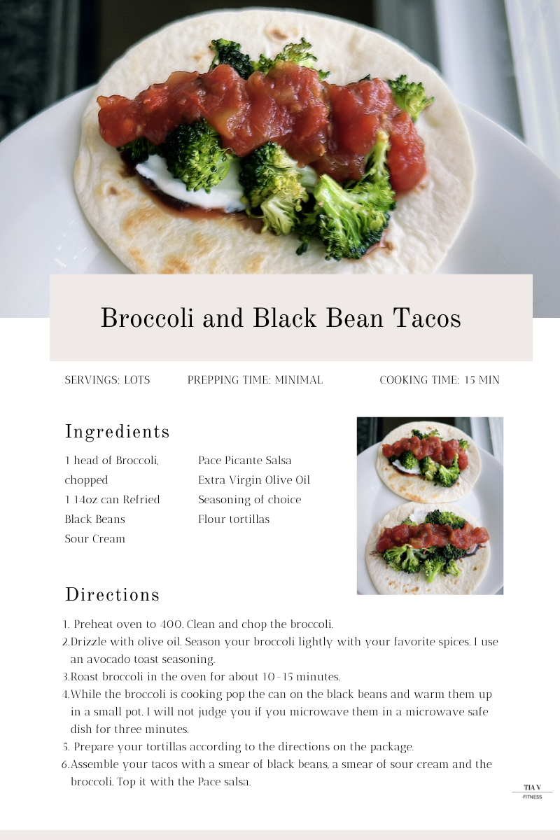 You want to talk about an easy dinner? When it’s Taco Tuesday and you don’t want to eat what everyone else is eating because you’re trying to cling to that meat-free life as much as you can…insert these extremely easy broccoli and black bean tacos. They is yummy. They is fast. They is healthy. You can always omit the sour cream if you aren’t doing dairy.